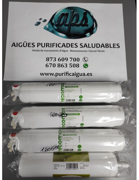 Kit de filtre mixte i 3 membranes encapsulades Baig Rebuig Recomax de 160 GPD per Osmosis Compacta Binature 4.0. Inclou un filtre mixte de Sediments CS de 5 micres + Filtre de Carbó Actiu GAC marca Green Filter a més de les 3 membranes encapsulades Baix Rebuig RECOMAX de 160 GPD.