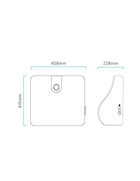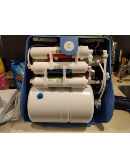 Osmosis Inversa compacta per consums d'aigua per beure+cuinar entre 1 i 3 persones. IDEAL PER CUINES AMB POC ESPAI.(altura x amplada x llargada--> 419 x 228 x 408 mm) Equip de 4 etapes de filtració, amb Bomba, capacitat de producció pic / máxima de 210 L en 24H. Té un dipòsit d'aigua tractada de 7 Litres útils, els quals subministra amb una mitja de 1,75L/min. Té sensor detecció de fuites d'aigua. Amb indicador frontal led de avís de canvi de filtres i averies.