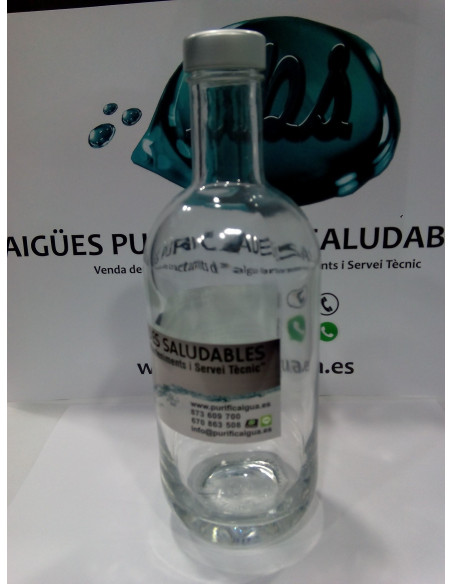 Botella de cristal de alta calidad, ideal para conservar el agua en buenas condiciones, para poner en las mesas para servir, o bien en la nevera. La pared de cristal está reforzada, es muy gruesa. Capacidad 0,75 Litros. Rellenable. Lleva tapón roscado con goma, de muy buena estanqueidad (con poca fuerza, queda bien cerrada). Posibilidad de suministro a restaurantes con etiqueta serigrafiada.