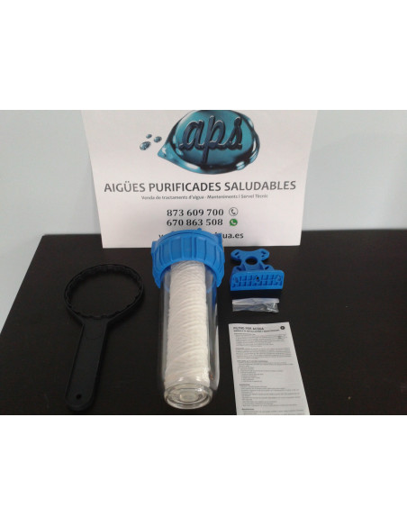 El Portafiltro de altura 9-3/4", con filtro de bobina de hilo de sedimentos de 50 micras, es ideal para instalarlo antes de la entrada de agua de los descalcificadores, entrada de agua general de la vivienda, o de las máquinas de Osmosis Inversa (en localizaciones donde haya mucha tierra/barro).