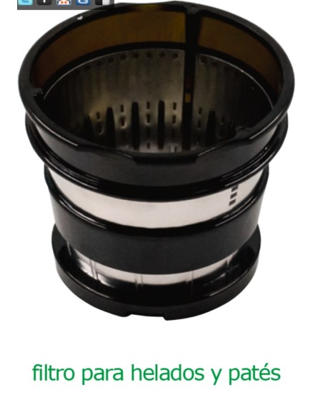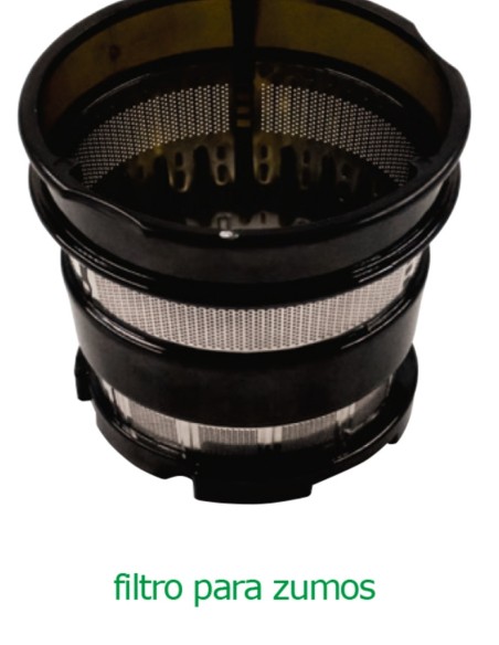 - Contenido de la caja: Base (MOTOR), Depósito de 500ml con salida para zumo y rechazo, 2 Jarras de 1 litro, prensa con doble eje de corte, Filtro fino para obtener zumos o leches vegetales, Filtro de helados para elaborar helados, patés vegetales, chucrut o salsas, tapa de seguridad, Cepillo de limpieza, Manual de instrucciones y Libro de recetas exclusivo “Pásate Al Lado Verde”